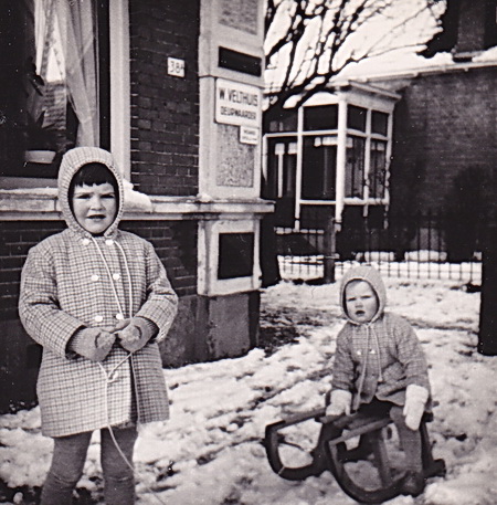 Marjan op de slee, zus Rita links, Langestraat 38a