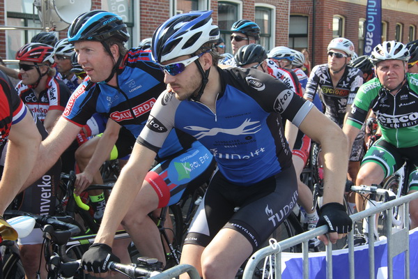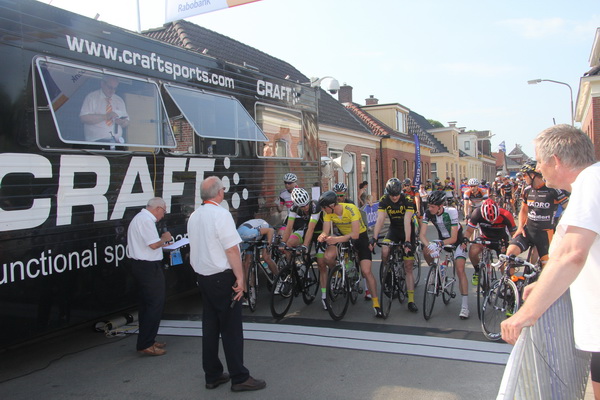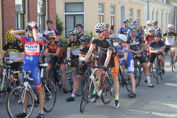 De rijders zijn verzocht zich op te stellen achter de meet. Het wachten is op een laatste deelnemer en op de ‘wegschieter’….