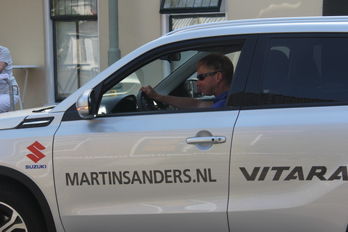 Dat is even wennen…. Na 8 wielerrondes in zijn opvallende gele Toyota over het parcours te hebben gescheurd, chauffeert Klaasjan Pijpker deze keer in een robuuste, maar toch ook wel wat grijze Suzuki…. (Nou ja, het blijft Japans…)
