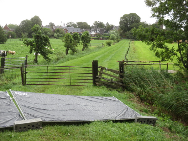 De regen en wind van gisteravond (het onweer bleek om ons heen te trekken….) bleken beproevend, de net geplaatste omheining met zeildoeken was niet bestand tegen het natuurgeweld en ging knock out. Het gevechtsterrein ligt er verder puik bij, prachtig groen, in dit verband een aangenamer kleur dan bloedrood….