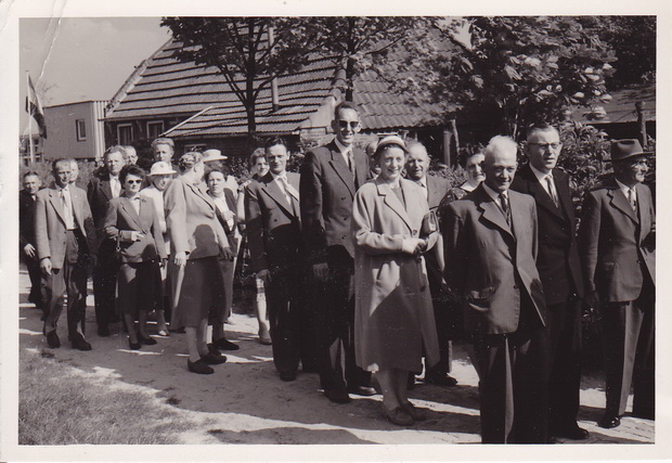 Keurige mensen die beschaafd in een nonchalant geordende rij staan te wachten tot….. Ja, tot wat eigenlijk? Nee, het gaat niet om belangstellenden die op een zonnige dag eind augustus 2015 het spektakel gaan meemaken van de Slag bij Noordhorn, reprise van 1581. Dat door de Stichting Schansenkrijg tot een groots evenement ontwikkelde initiatief zal op 28, 29 en 30 augustus aanstaande voor veel reuring in dit anders zo rustige dorp zorgen. De mensen op de kiek staan ontspannen te wachten tot ze toegang krijgen tot de nieuwe speeltuin aan de zuidkant van de Hervormde Kerk. Dat was destijds in mei 1958 voor het dorp Noordhorn een groots gebeuren! Niet alleen werd in 1956 de nieuwe openbare lagere school aan de Oosterweg in gebruik genomen (op de achtergrond een deel van de opvallende uitbouw, de hoofdenkamer), twee jaar later dus vlak in de buurt een openbare speelplaats, gerealiseerd door ’t Plaatselijk Nut! Gepast glunderend staan ze op de foto, mensen als koperslager Cees de Boer (voorzitter Nutsbestuur) en, met hoed, schilder Klaver uit de Schippersstraat. De jongeman die er bovenuit steekt, met zonnebril? Jan Wieringa, die opgroeide aan de Langestraat, naast de werkplaats van Toyota Pijpker (noordkant). ‘Lange Jan’ werd ie later wel genoemd, of toen ook al? Wáár de mensen zo rustig staan te wachten? Op het Torenpad, toen nog niet bestraat zo te zien. Het huis(je) dat op de achtergrond als decor dienst doet, werd geruime tijd bewoond door de familie Duisterwinkel. Later trok Wobbe Jonkman erin, samen met de weduwe Kamstra. Wobbe overleefde haar, maar het huisje niet…. afgebroken begin zeventiger jaren. Nu staan er de bejaardenwoningen van de Torenhof, al lang niet meer louter bewoond door mensen op leeftijd. Nee, geen toeloop dus voor wat betreft het naspelen van de Slag bij Noordhorn op 28, 29 en 30 augustus…. In 1958 ging het om een lokaal hoogtepunt dat een verrijking van het dorpsleven accentueerde. (Overigens ging de speeltuin al weer teloor in de jaren zeventig…) Nu in 2015? Oorlogsromantiekdriedaagse… Ach, andere tijden, andere zeden…. Ook de na te spelen Slag van 1581 (zie www.schansenkrijg.nl) is binnenkort Noordhorn….Toén! (JB)