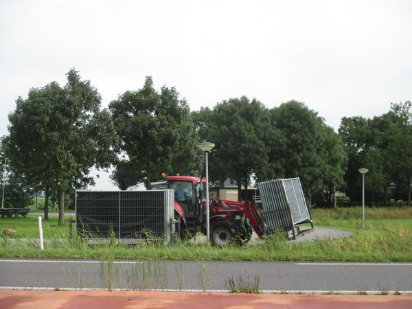 Tractorchauffeur Haas, achteruit rijdend, heeft een ‘pakket’ schermen gehaald van het strijdterrein en zet ze nu neer aan de rand van de keerlus. Kunnen ze verder worden vervoerd. Het is maandag 31 augustus, “the day after”… De dag waarop nog meer helpende handen ervoor zorgen dat de sporen van de Slag worden uitgewist. (En het opgespaarde regenwater, met rente, alsnog de uitzonderlijke omstandigheden van het weekeinde beklemtoonde!)