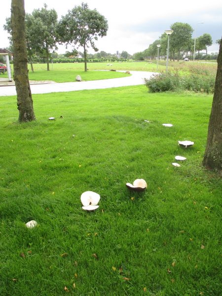 Stervende paddenstoelen op het grasgebied bij de keerlus. De weidechampignons leggen het loodje, in schoonheid….