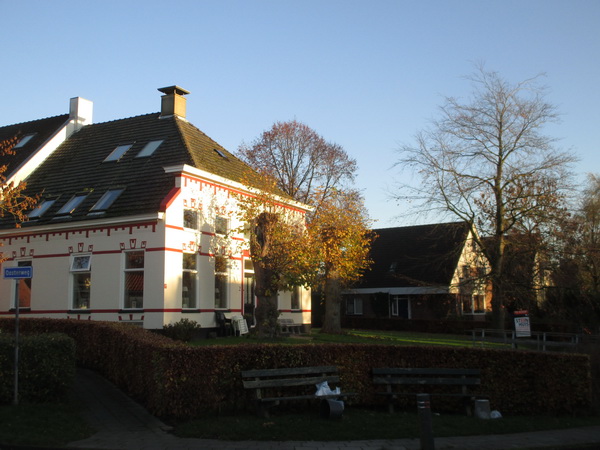 Ook hier aan de Rijksstraatweg worden de woningen eens nadrukkelijk in het (herfst)zonnetje gezet. Vooraan links de recent gerenoveerde woning waarin vroeger de familie Van der Molen woonde. Daarnaast het huis van Hanneke Hinnen, vroeger de statige heer Dorenbos die in zijn laatste jaren niet zo goed meer zag. Hij wandelde ook op oudere leeftijd graag naar het dorp om even bij te praten in het winkeltje van Aaltje Visser…..