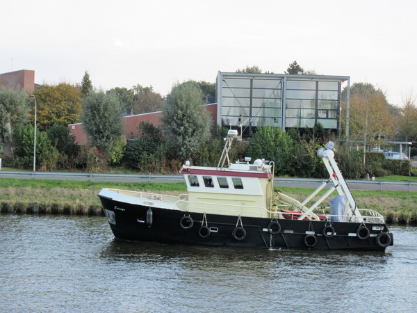 Een bijzondere boot, wachtend voor de tafelbrug. Er moet eerst een binnenvaarder verschijnen, dan mag dit jacht (?) ook verder….