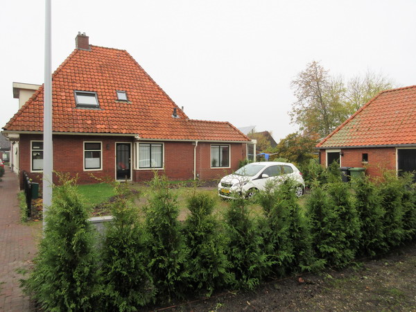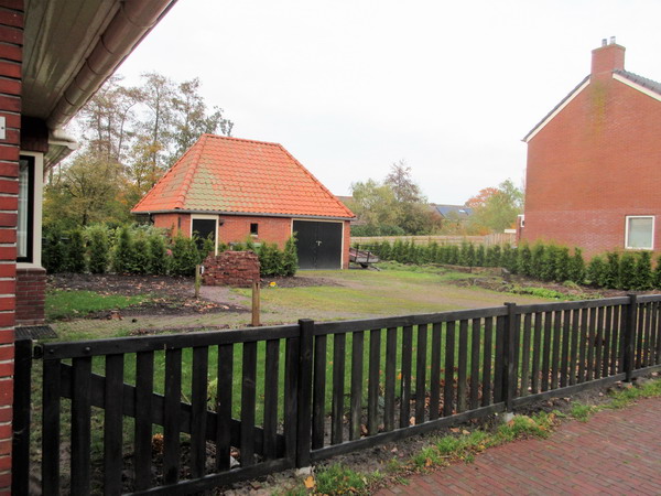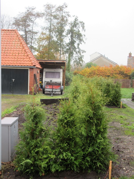 Nieuwstraat-aanwonende Wim Burgler heeft zijn vergroot erf omheind met altijd groen blijvende heesters, thuja’s. (Prettiger om te zien dan schuttingen…)