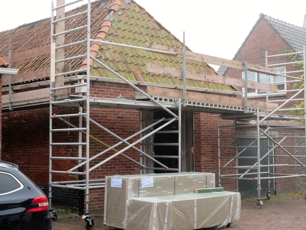 Hier, aan de Nieuwstraat, gaat een fikse onderhoudsklus van start. De garageschuur van Jan Tempel Jzn krijgt een nieuw dak. Vroeger was dit een van de twee diaconiehuizen, waarin behoeftige gezinnen werden ondergebracht, twee per pand. Destijds stonden de diaconiehuizen bijna pal op de straat, er is een stuk vanaf gehaald ten behoeve van de voorbijgangers.
