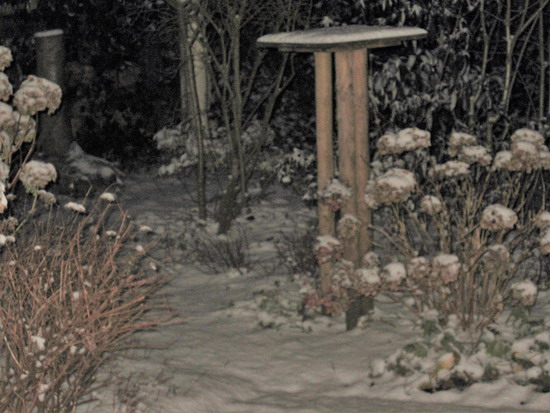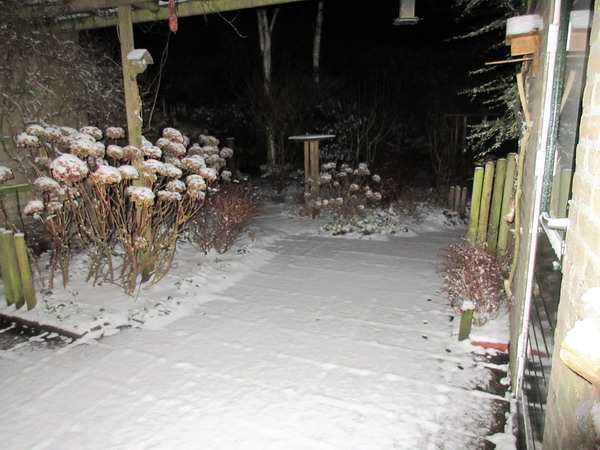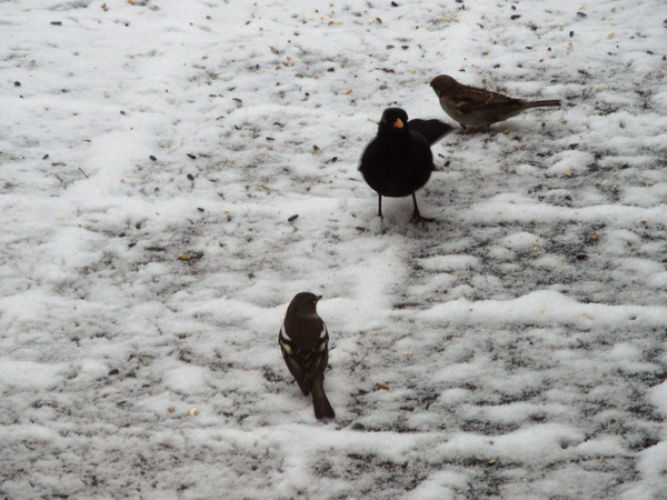 ’s Morgens vroeg een eerste blik en een eerste kiek vanuit de achterdeur richting tuin: VERSE SNEEUW!Niet bepaald scherp, maar de kiek geeft wel een indruk van de spaarzame decembersneeuw.De vogels kijken er nog wat vreemd tegenaan…. Huismus, merel en….? Toch een vink?!
