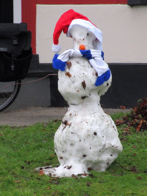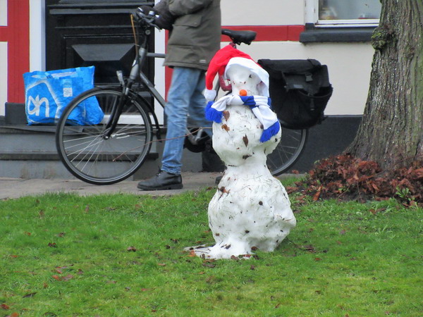 Een dag na de spaarzame eerste sneeuw is er al nauwelijks meer iets over….. Een enkele sneeuwpop, hier voor woonboerderij Sicke Benninghestede, zegt langzaam maar zeker “Vaarwel”!