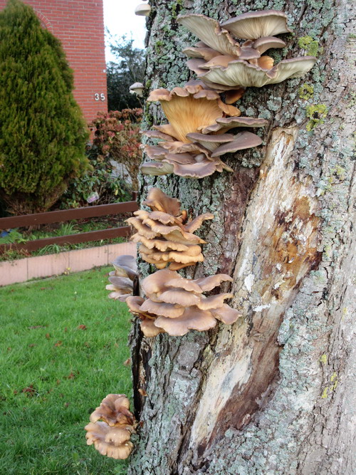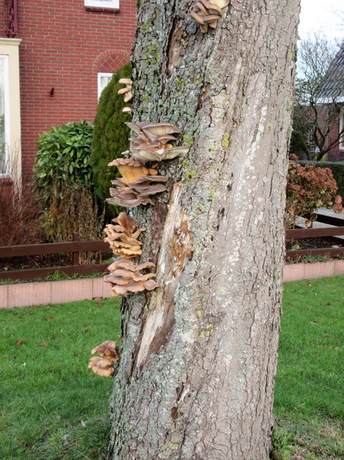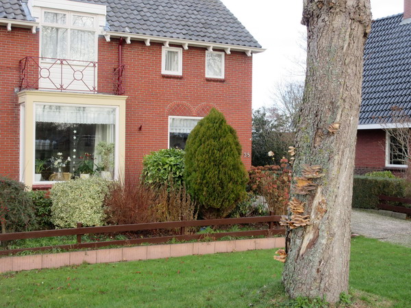Als je vanaf de Industrieweg de bocht naar links richting de tafelbrug neemt, zie je op de stam van de eerste kastanje een reeks paddenstoelen. Het is voor het huis van de Datema’s waar vroeger Joh. Hiemstra en zijn gezin woonden (en daarachter de postduiven…)Volgens een van de aanwonenden verderop zijn vele van deze kastanjes aangetast door zwamvorming. De kans op kappen is groot….Wel een fascinerend gezicht overigens….