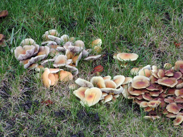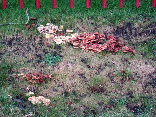 Verderop voor het huis van de fam. De Jong een grote groep kleinere paddenstoelen in het bermgras….