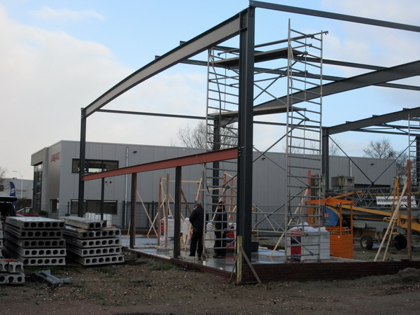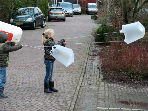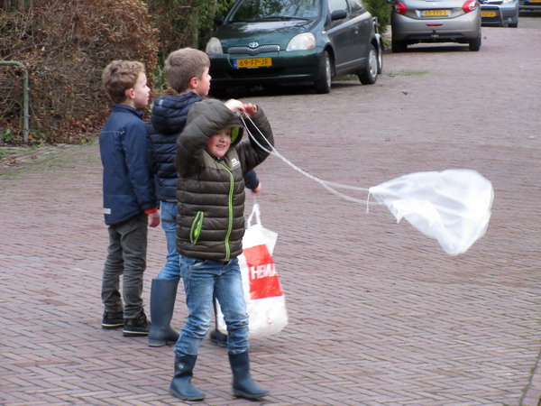 De nieuwe Kooihal aan de Industrieweg, werken onder moeilijke omstandigheden. De grote kraan is opgevouwen vanwege de risico’s van de stormachtige noordwester…Vanuit de zuidwesthoek….Ja, dit is leuk! Plastic zakken aan touwtjes, windvangers!Soms gaat het fout, hebben twee sneue jongens het nakijken. Waar is de plastic zak gebleven??!Olala, in de boom, onbereikbaar! (Daar helpt geen lievemoedertje aan…. Pa misschien?!)