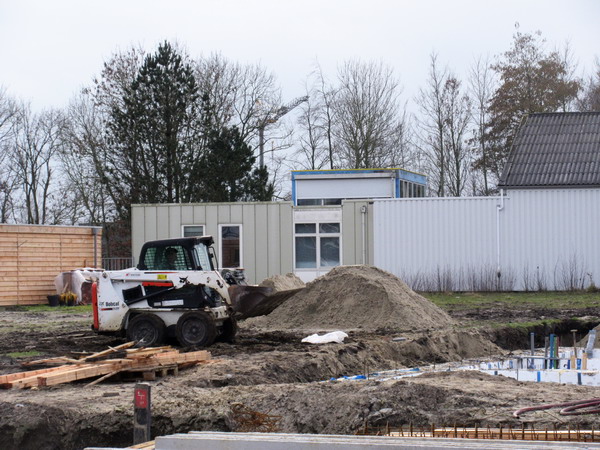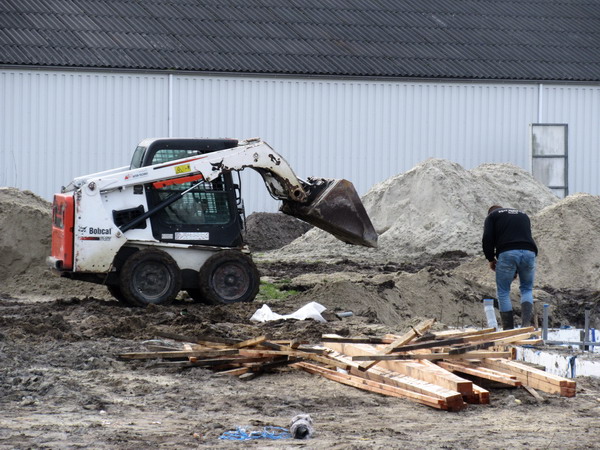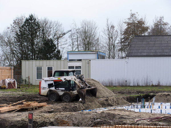 Activiteit op de bouwplaats van de fam. Kamminga aan de Rijksstraatweg (westkant), kavel A.Een zgn. “Bobcat” schept speciaal zand van de bult naar de fundamenten….Even controleren of het zand goed terecht komt….“Bobcat”…. Doet me ineens denken aan de vroegere US-muziekgroep Bob Crosby and his Bobcats, soortement dixieland in marstempo… Gedachten nemen soms rare sprongen…