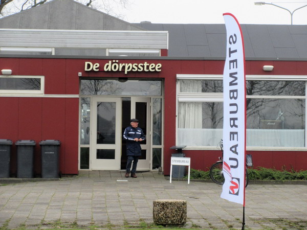 In Noordhorn is het stembureau gevestigd in het dorpshuis “De Dörpsstee”, een logische plek lijkt me. Toch een verandering! Het “ontvangstcomité” zit deze keer aan de rechterkant in de hal (als je binnenkomt), de stemhokjes staan links. Nee, dat heeft verder niks te betekenen….Zo, we hebben van ons stemrecht gebruik gemaakt. Een hokje rood kleuren bleek gemakkelijker dan het opvouwen van het superformaat stembiljet…