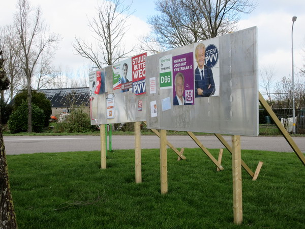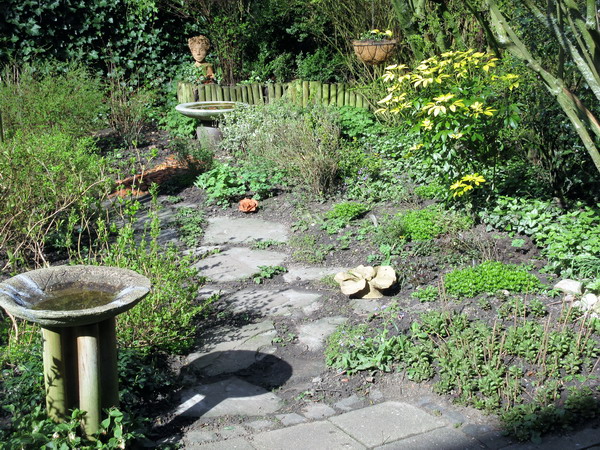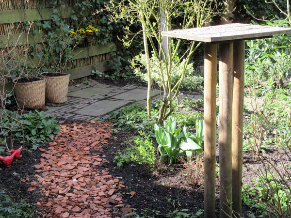 Onze achtertuin die steeds duidelijker een voorjaarskarakter krijgt…Het schervenpaadje naar het plat aan de zuidzijde.De verkiezingsborden hebben enige dagen respijt gekregen, kunnen ze enigszins op verhaal komen in afwachting van de Europese verkiezingen…