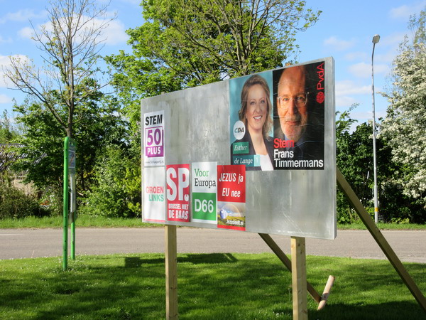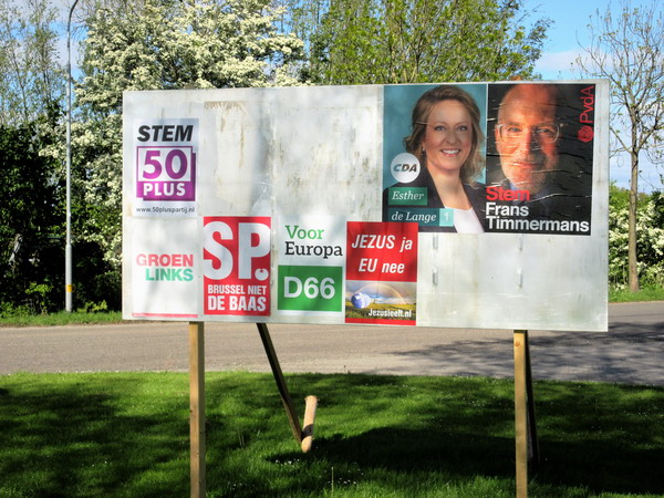 Dit ene verkiezingsbord is niet eens volgeplakt. Of speelt de verkiezingsstrijd zich steeds meer af op de smartphone?