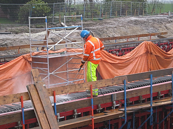 Terug bij de tunnelkuip aan de oostkant, net op tijd om te zien hoe een bekistingspaneel van de muur wordt ‘afgeplukt’….