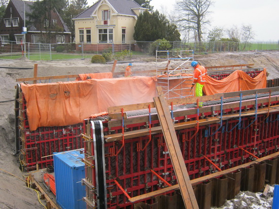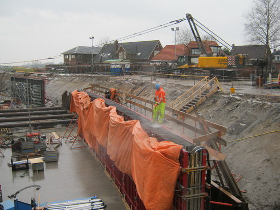 Maandag worden de wanden aan de oostzijde van de tunnelbak gestort. Dinsdag worden de wanden aan de westkant gestort. Er zijn dus maandag en dinsdag veel vrachtwagens (“betonmixers”) in Noordhorn te spotten. Tijdens het storten van beton zitten de timmermannen overigens niet stil. Zij bereiden elders het vlechtwerk voor en brengen ijzerwerk aan.