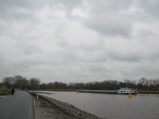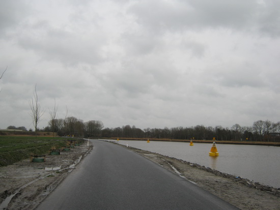 De fietsers kunnen weer over het tijdelijk fietspad (asfaltweggetje Van Starkenborghkanaal, tussen Noordhorn en Den Ham).