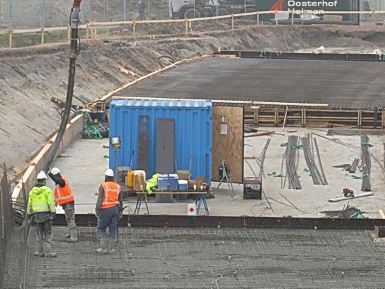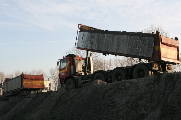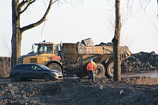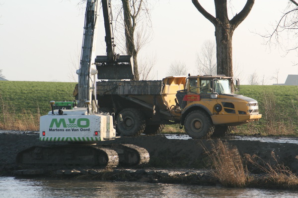 De Zwama-auto’s blijven rijden met de aan het ruim van de Con Zelo ontfutselde bagger die op de groeiende helling van de nieuwe N355 wordt gedeponeerd. Een shovelbestuurder brengt op dezelfde helling enige vorm in en aan het grondlichaam….