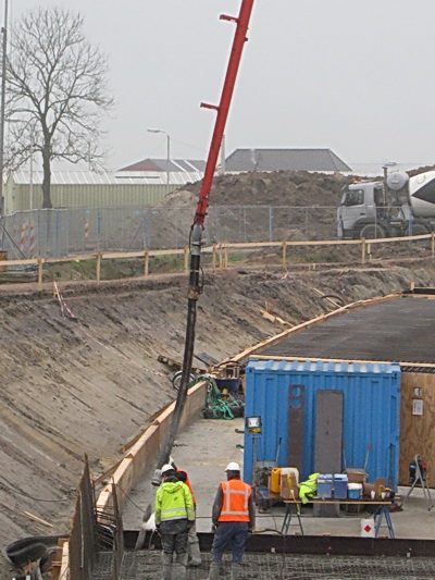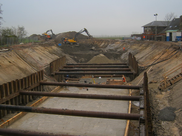De tijdelijke aanlegsteiger van Martens en Van Oord aan de oostkant van de bouwplaats van de NVH-brug. Aan de overkant links is het zuidelijke talud te zien. De Con Zelo voert de bagger aan, net als de “Hoop”. Vol vooruit, leeg achteruit, want een keerlus kent het Van Starkenborghkanaal niet op dit korte traject.