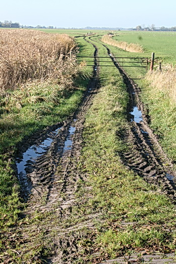 We wandelen naar het betonpad, terug naar het dorp. Beetje nevelig, sfeervol. Op het “stoppelland” aan de linkerkant in de verte twee gelukzoekers, druk doende met hun ‘metaaldetectoren’ of hoe je die apparaten ook noemt. Ik kan niet goed onderscheiden wie daar bezig zijn onvermoede schatten uit de aarde te voorschijn te ‘detecteren’…